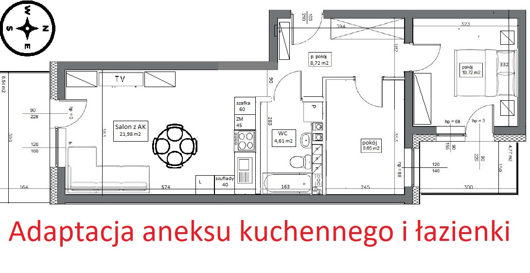 Możliwość adaptacji na 3 pokoje z aneksem kuchennym